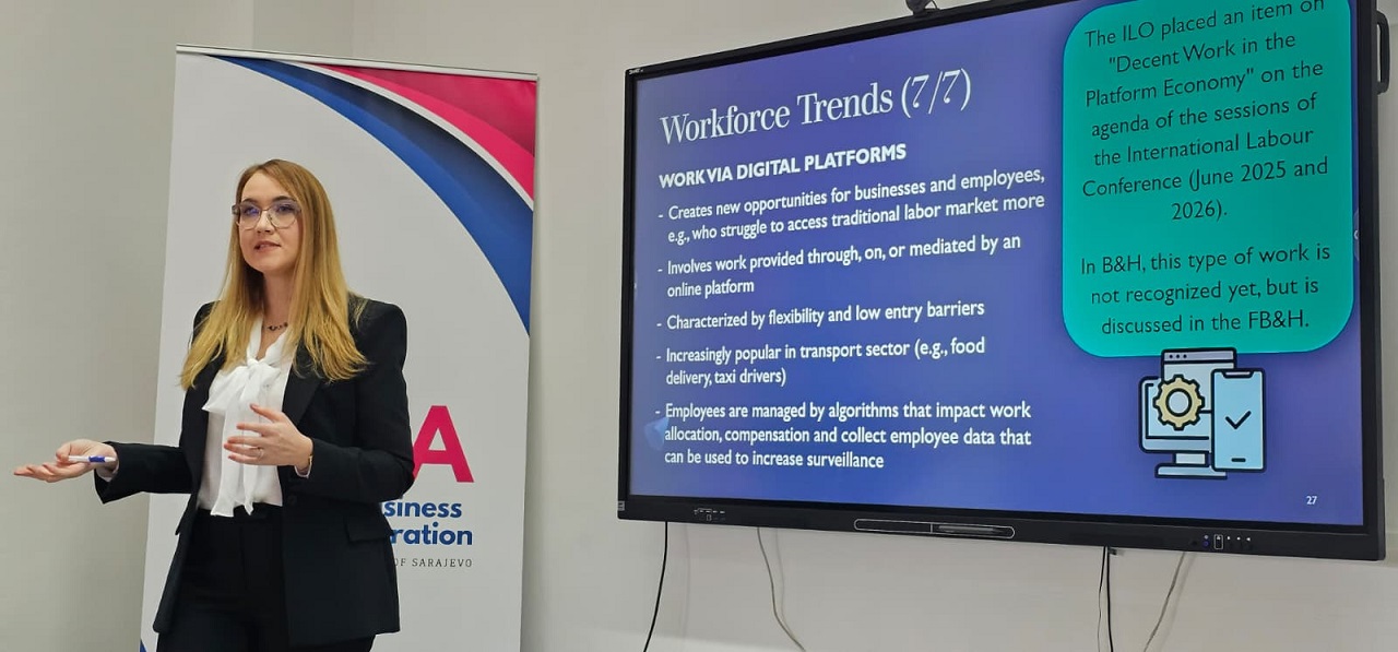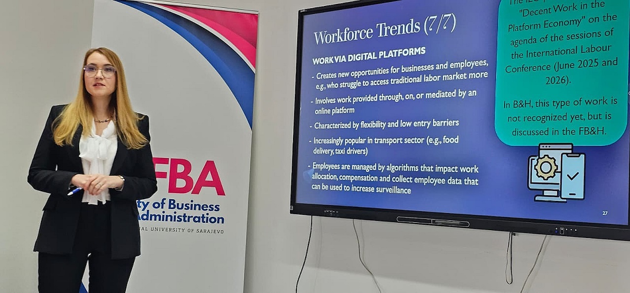 U četvrtak, 6. novembra 2025. godine, dr. Aida Hamur, direktorica Advokatske kancelarije “Legal Partners”, održala je informativno i interaktivno predavanje pod nazivom „Radno pravo u Bosni i Hercegovini i kako odražava trendove na tržištu rada” u okviru predmeta ECON455 Labor Economics na Fakultetu menadžmenta i javne uprave (FBA).